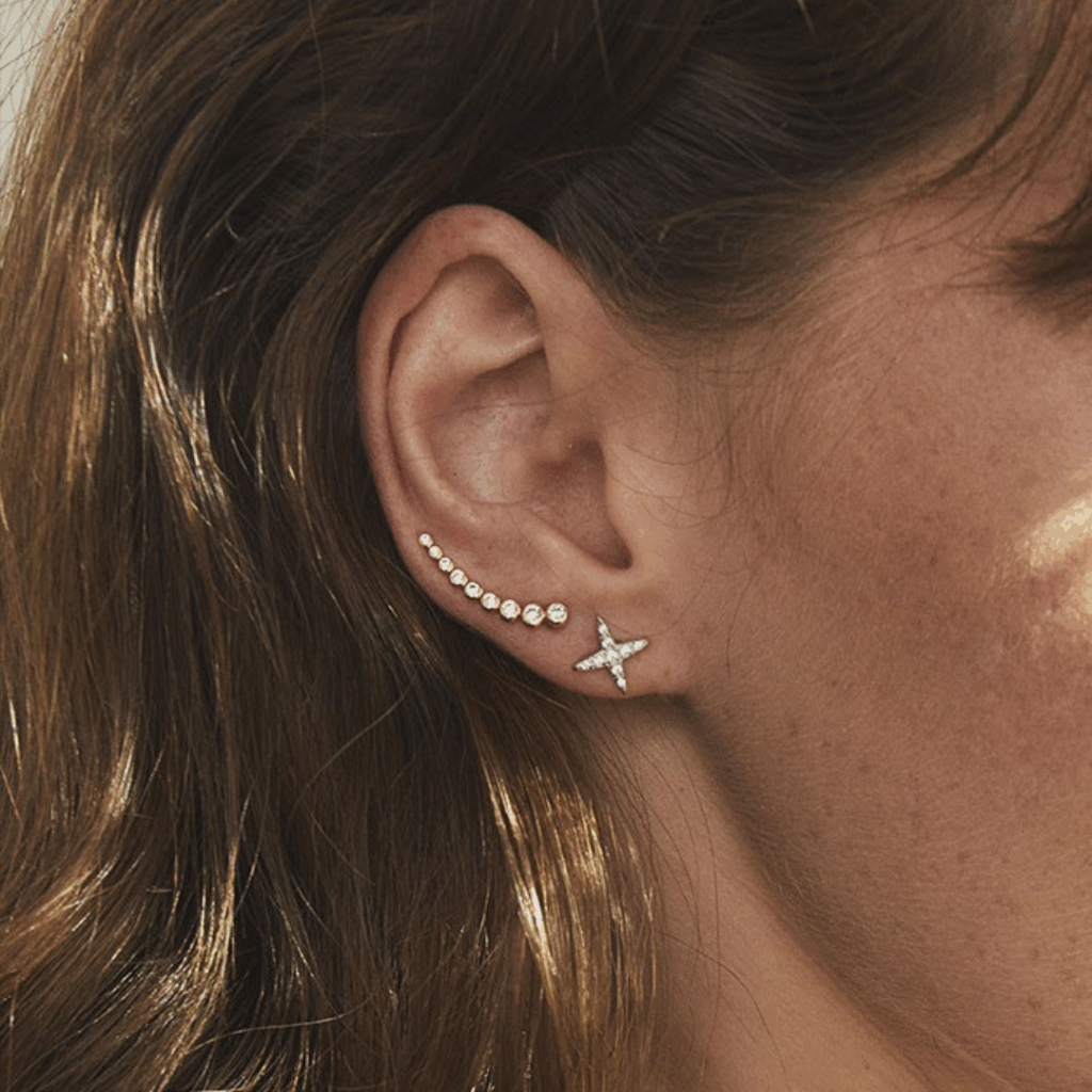 - Les climbers : parfois fines et minimalistes, parfois volumineuses et audacieuses, ces boucles grimpantes épousent la courbe du lobe. Résultat ? Un seul perçage suffit à habiller toute l’oreille.
